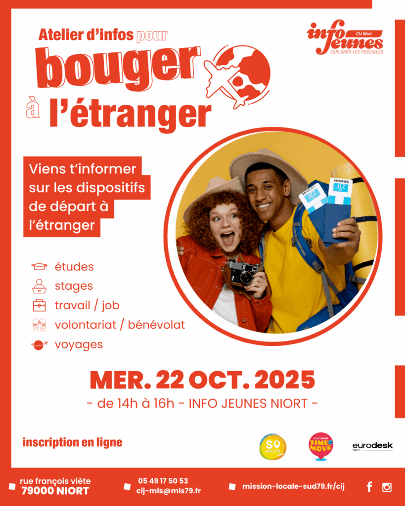 Tous les 2 mois, Info Jeunes Niort organise une info collective pour te faire découvrir les dispositifs/programmes pour partir à l'étranger, les démarches à effectuer et répondre à toutes tes questions. Il est ouvert à tous les jeunes à partir de 16 ans.